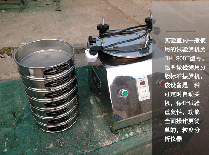 實(shí)驗(yàn)室內(nèi)一般使用的試驗(yàn)篩機(jī)為DH-300T型號(hào),也叫做檢測(cè)用分級(jí)標(biāo)準(zhǔn)振篩機(jī),該設(shè)備是一種可定時(shí)自動(dòng)關(guān)機(jī),保證試驗(yàn)重復(fù)性,功能全面操作更簡(jiǎn)單的,粒度分析儀器。可將一種顆粒料同時(shí)精密分出2~8個(gè)粒子段。可用于漿液料的細(xì)度及雜物含量分析,噪音小,重量輕;平臺(tái)操作,無(wú)須固定。調(diào)節(jié)振動(dòng)快,可調(diào)節(jié)振幅。