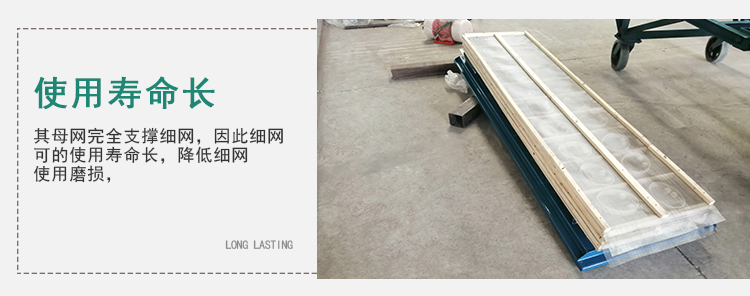 4、其母網(wǎng)完全支撐細(xì)網(wǎng),因此細(xì)網(wǎng)可獨(dú)得較長(zhǎng)之壽命,而降低細(xì)網(wǎng)耗材使用,淤長(zhǎng)時(shí)間 之生產(chǎn)過(guò)程可降低諸多成本。