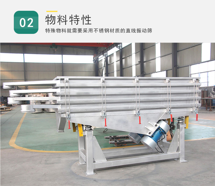有些物料帶有腐蝕性,例如:硝酸、硫酸等,就需要采用不銹鋼材質(zhì)的直線振動(dòng)篩,還有一些有嚴(yán)格的衛(wèi)生標(biāo)準(zhǔn)例如醫(yī)藥行業(yè)和食品行業(yè),例如大豆,糧食,中藥粉等,需要用不銹鋼直線振動(dòng)篩