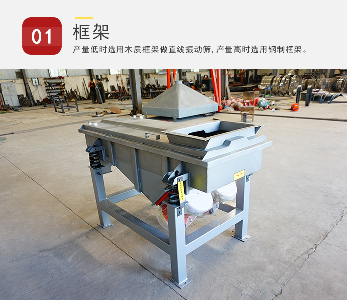 產(chǎn)量低時(shí)選用木質(zhì)框架做直線振動(dòng)篩,因?yàn)樵谖锪虾Y分產(chǎn)量較大時(shí)容易斷裂。產(chǎn)量高時(shí)選用鋼制框架,鋼制框架的承受力較大,不易斷裂,不會(huì)造成對(duì)篩分過(guò)程的影響