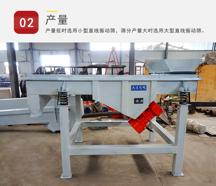 產(chǎn)量低時(shí)選用小型直線振動(dòng)篩,篩分產(chǎn)量大時(shí)選用大型直線振動(dòng)篩