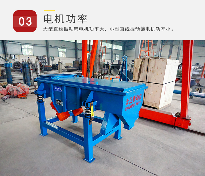 大型直線振動(dòng)篩電機(jī)功率大,小型直線振動(dòng)篩電機(jī)功率小,看您的篩分要求產(chǎn)量大就選大型直線振動(dòng)篩,因?yàn)楣β蚀螅暮Y分要求產(chǎn)量低的話就選用小型直線振動(dòng)篩,電機(jī)功率小的